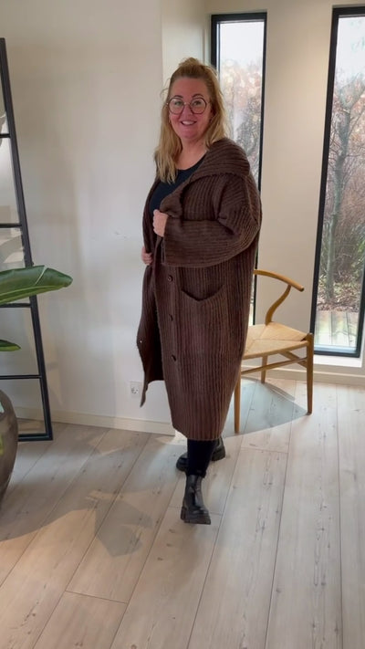 Oversize / loosefit lang cardigan i vamset kvalitet uden krads og den er elsket af kvinder uanset om de er en str. 36 eller en str. 46.